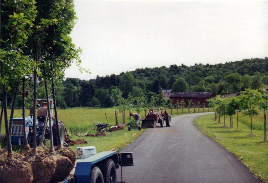 Over 20 years ago (1997) Herb Techmer, his father Horst and friend Dietrich lined an entry with Red Oak trees leading to the Culinarian’s Retirement Home in New Paltz, NY. Herb is operating the blue tractor on left. Horst Techmer was taking the photo.