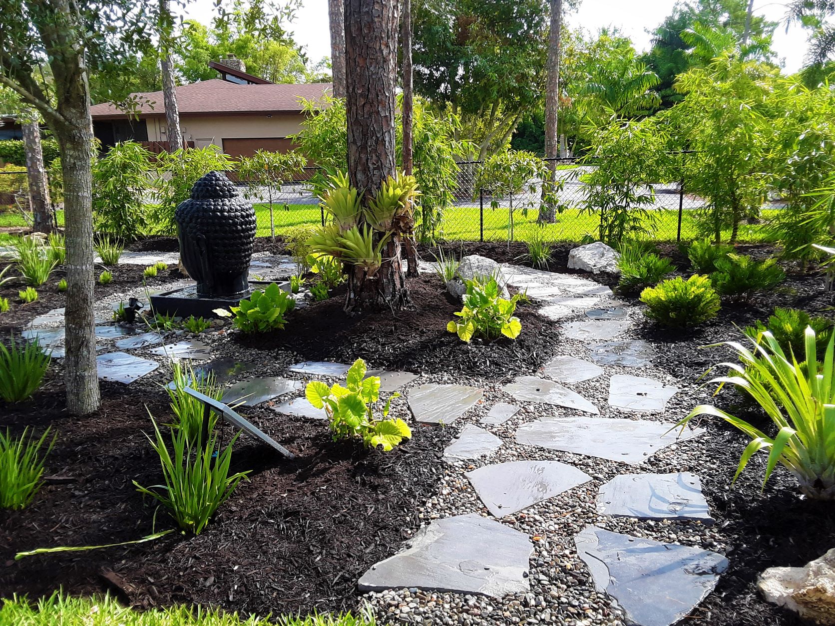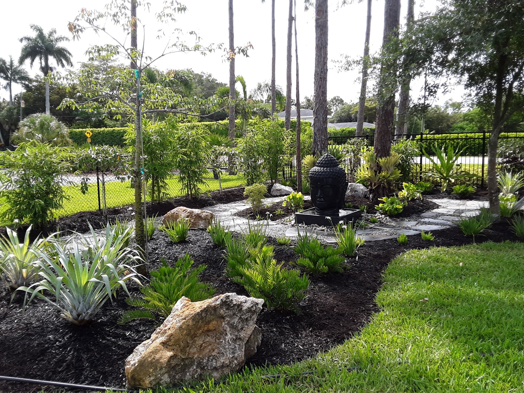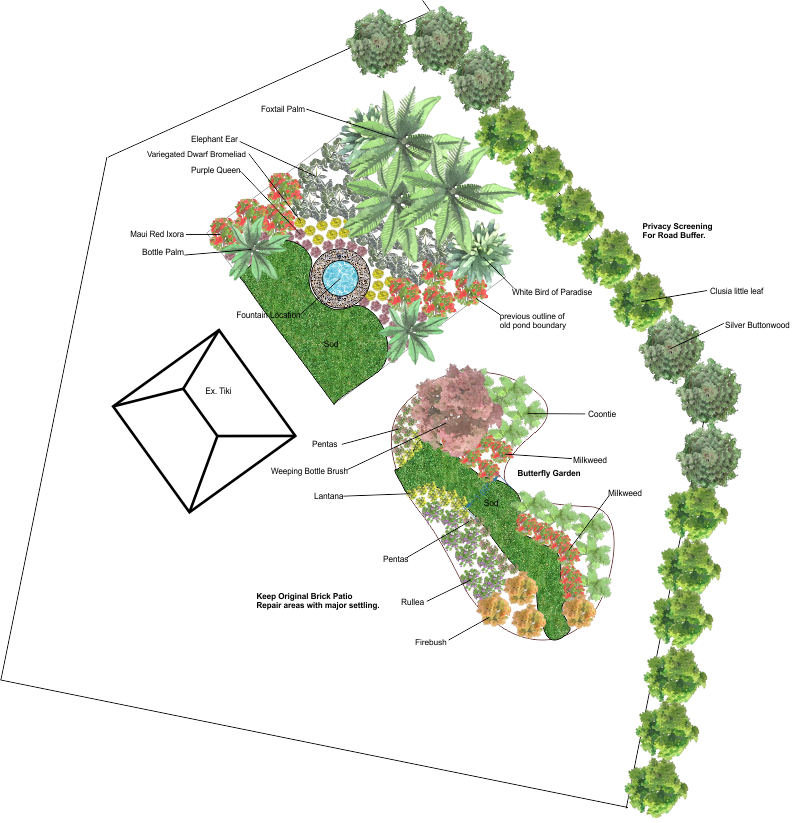 This Project was borne more out of necessity. We converted an outdoor living space that had a very troubled old DIY pond (aka mosquito breeding facility.) We installed lush tropical plantings. The garden incorporated a hand carved Italian white marble fountain. The garden was situated near a road so planting privacy screening hedges was needed to complete the space. We also added a small butterfly garden for the clients daughter.