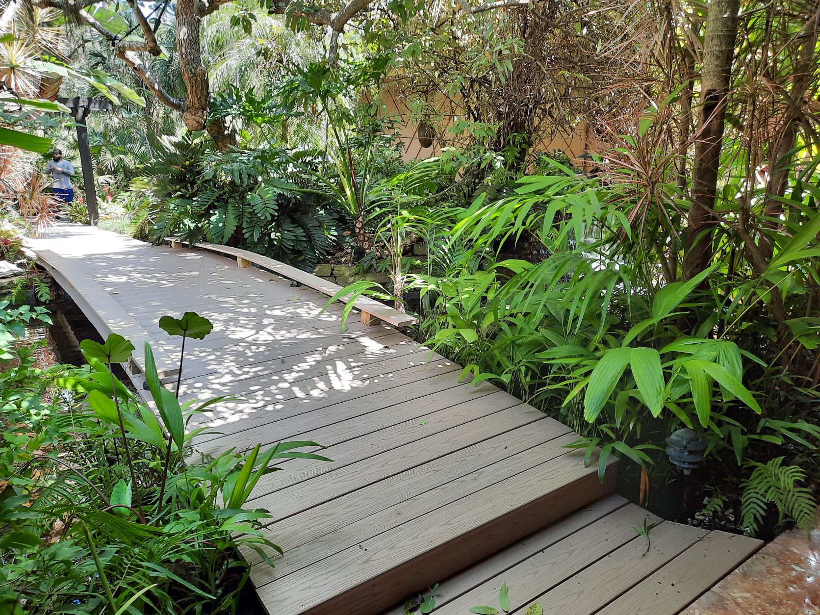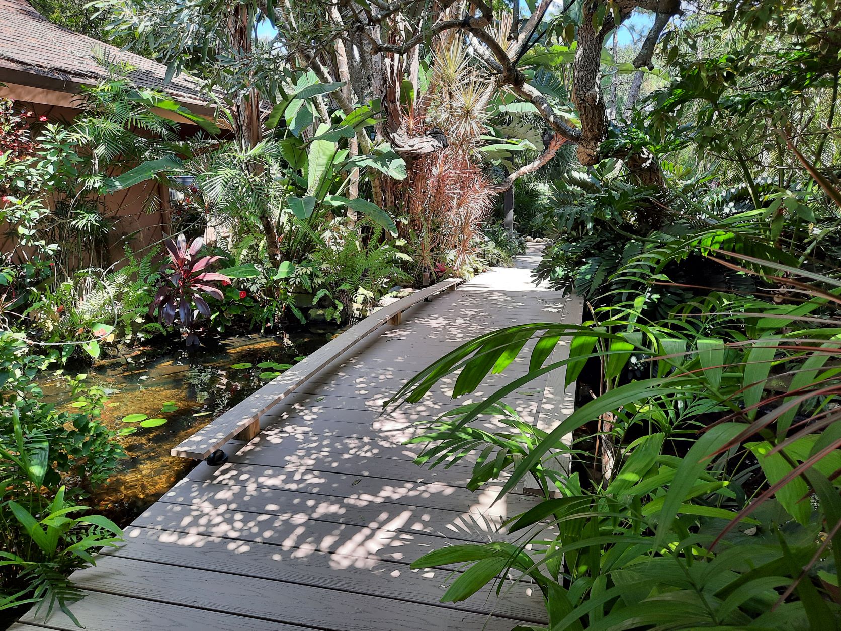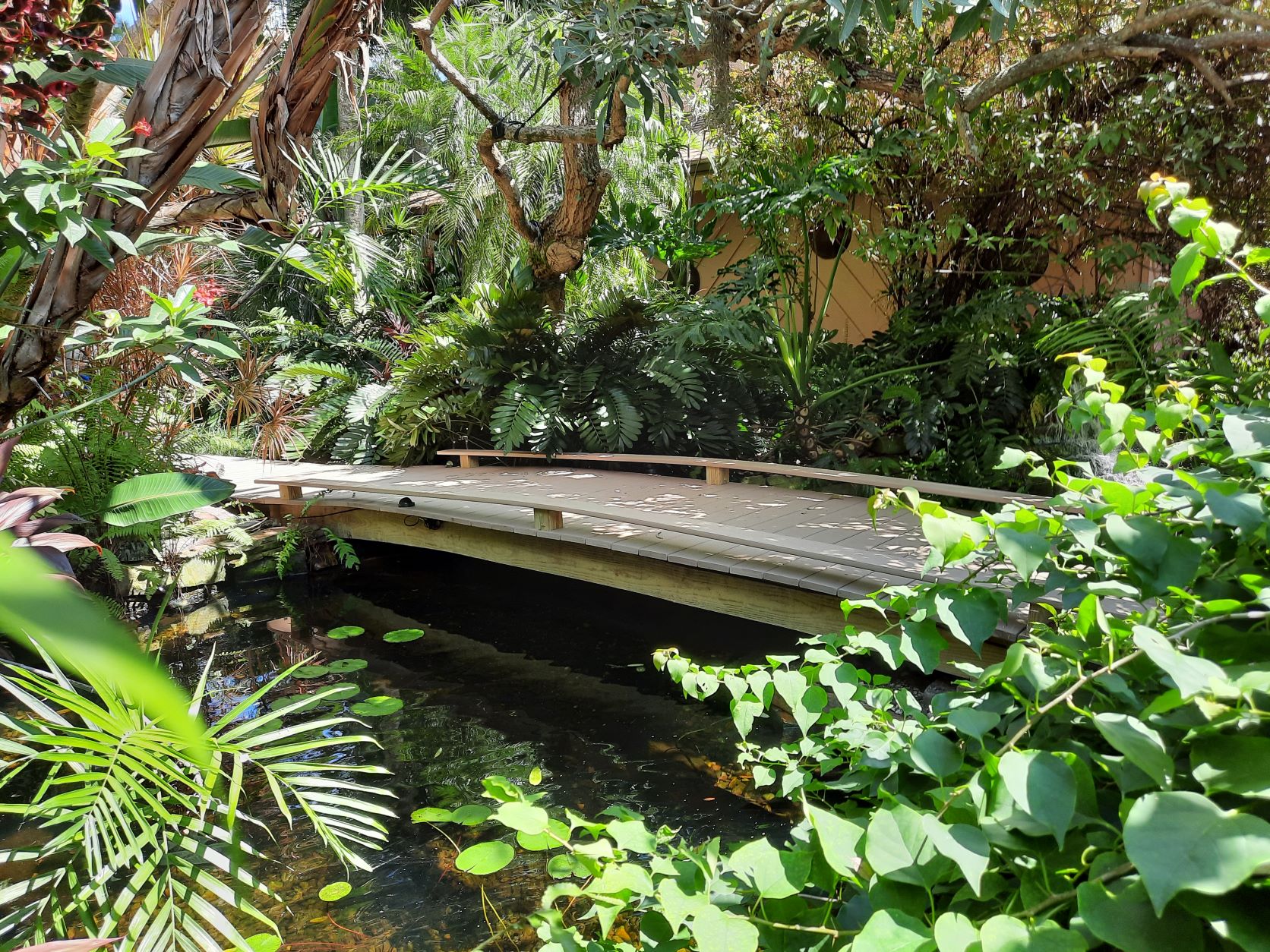 The Japanese Strolling Garden is meant to create a peaceful space. Sounds of water from the Buddha Fountain ( yes I know, not Japanese) blend with Asian themed plantings of Bamboo, Tibochina, Silkfloss Tree, African Iris and ground orchids.