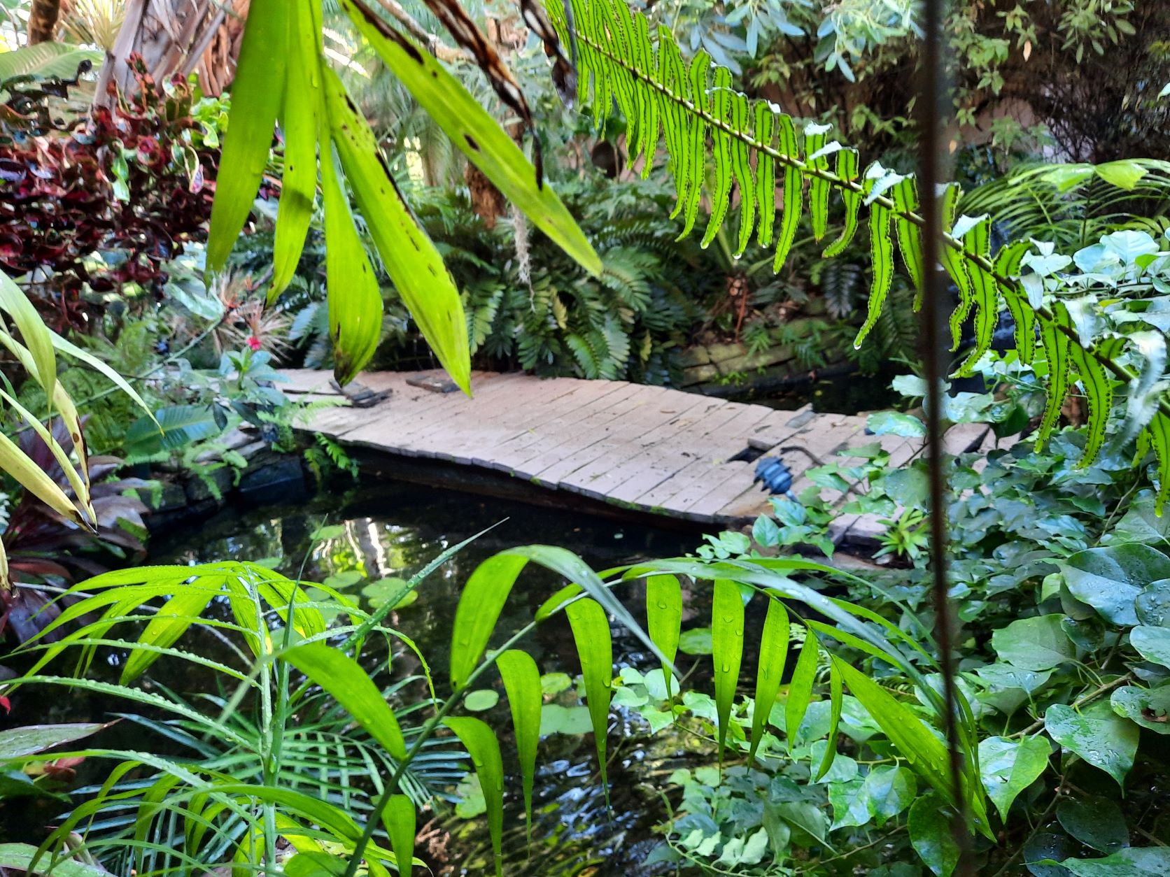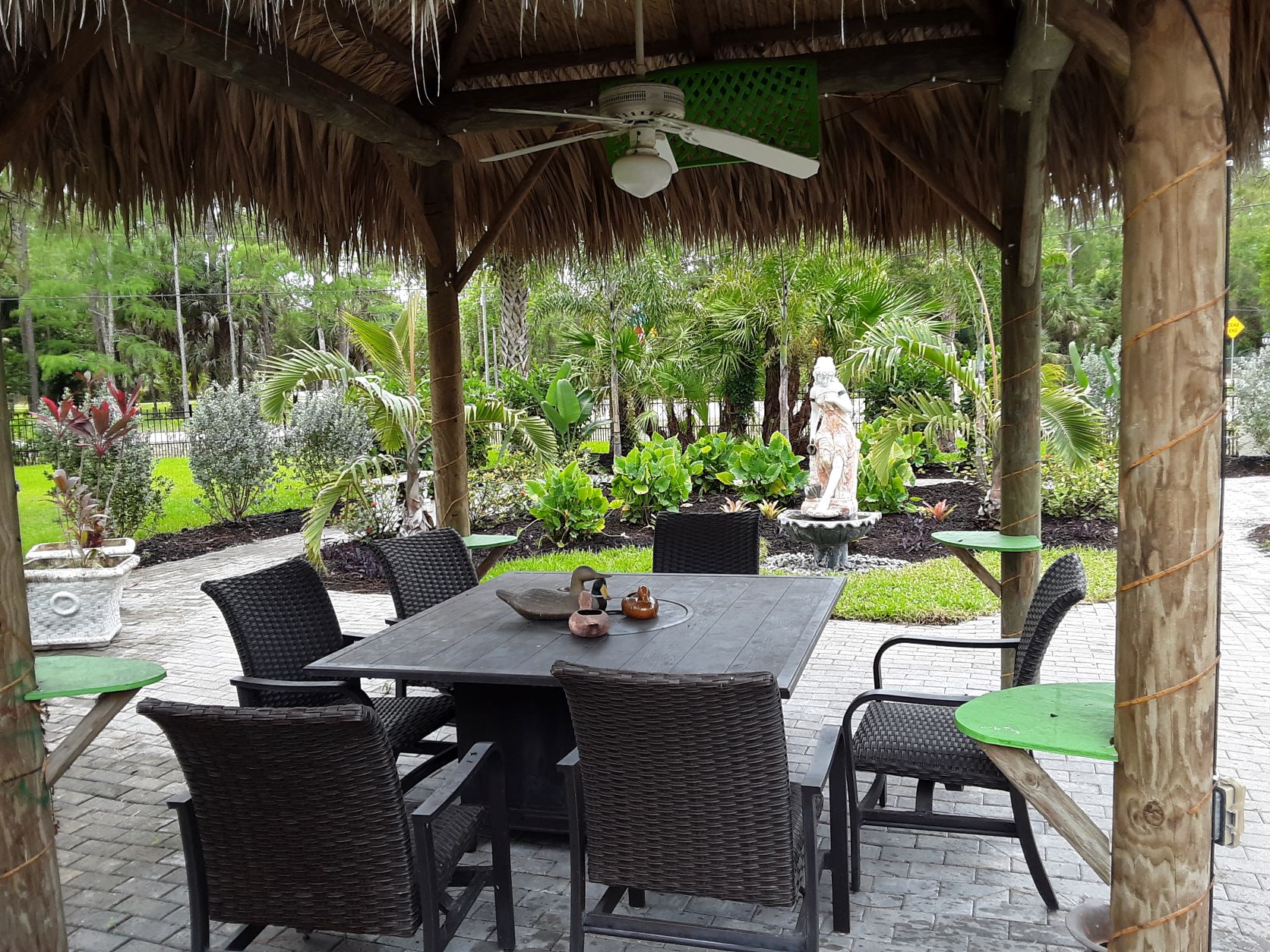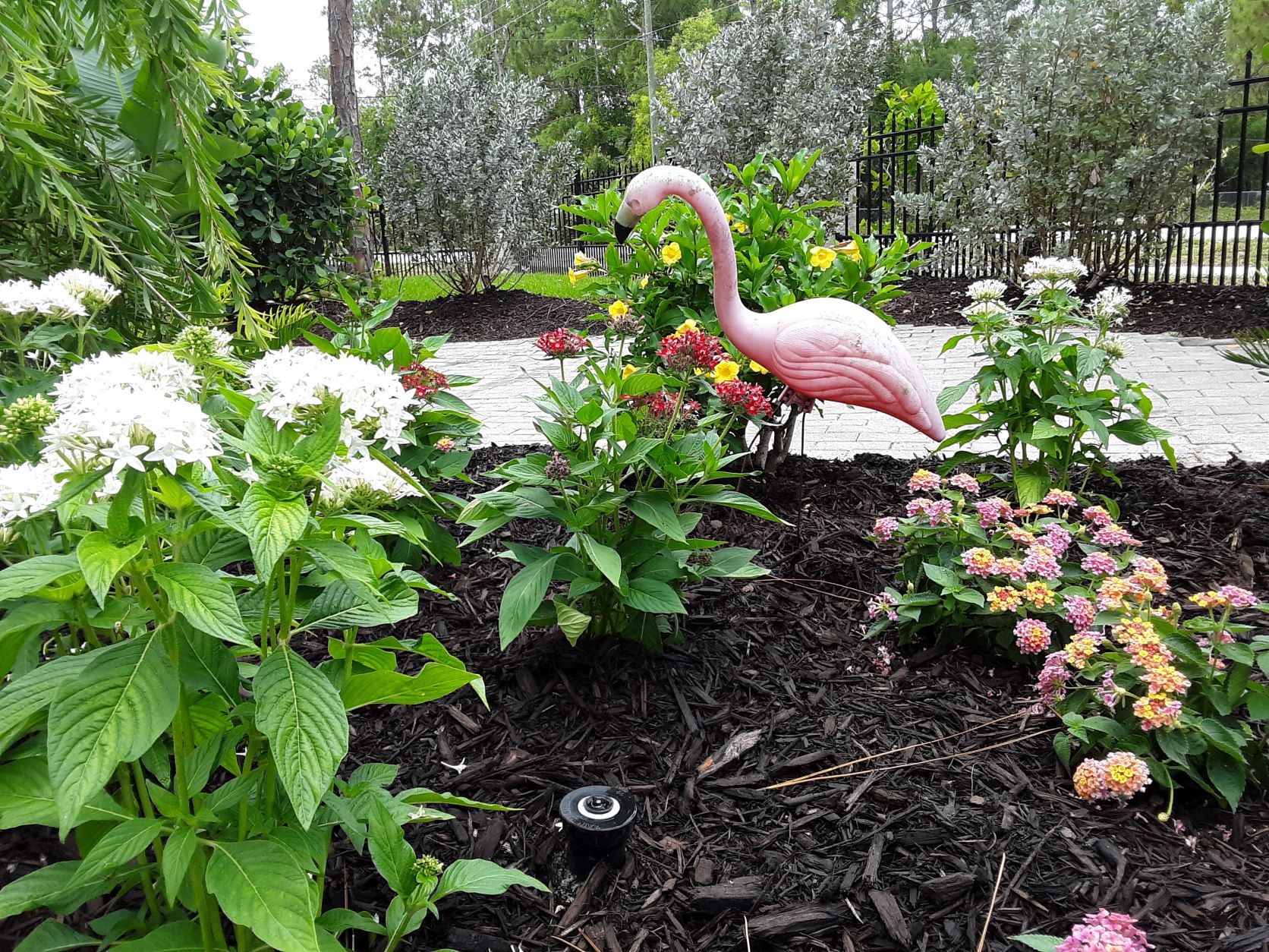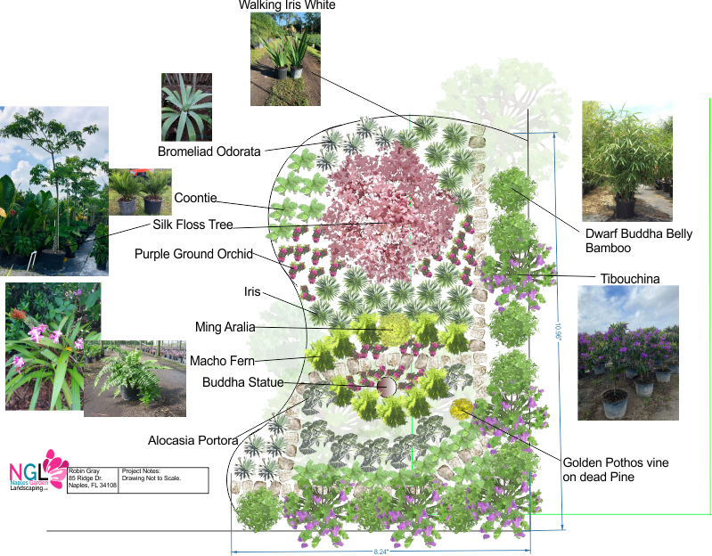The Japanese Strolling Garden is meant to create a peaceful space. Sounds of water from the Buddha Fountain ( yes I know, not Japanese) blend with Asian themed plantings of Bamboo, Tibochina, Silkfloss Tree, African Iris and ground orchids.