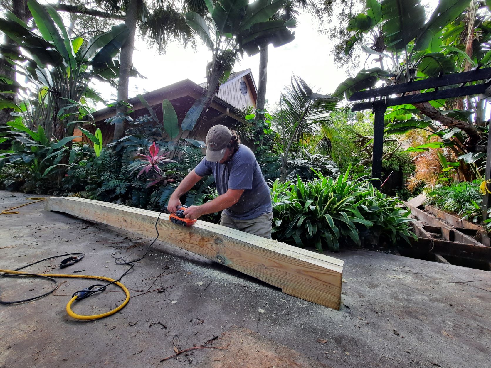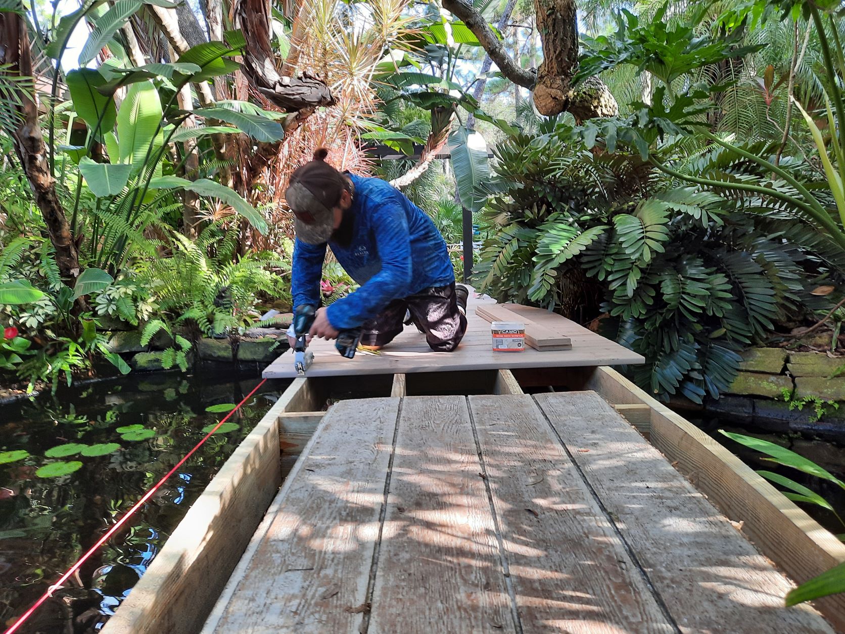 We came upon this “floating bridge” (support structure had rotted away) in Crossing a 15 feet gap along a front entry walkway leading to the clients front door. We had to re engineer the the bridge building concrete footers with reinforced steel to keep the new bridge span above the water line. Using beefy 4 beefy 2×12 inch pressure treated lumber we created a slight curve in the structural bridge spans. The new walkway and bridge deck were planked with synthetic decking. Custom path lights where then installed to illuminate the bridge and path at night leading to the front door. You view view more Japanese garden bridges here.