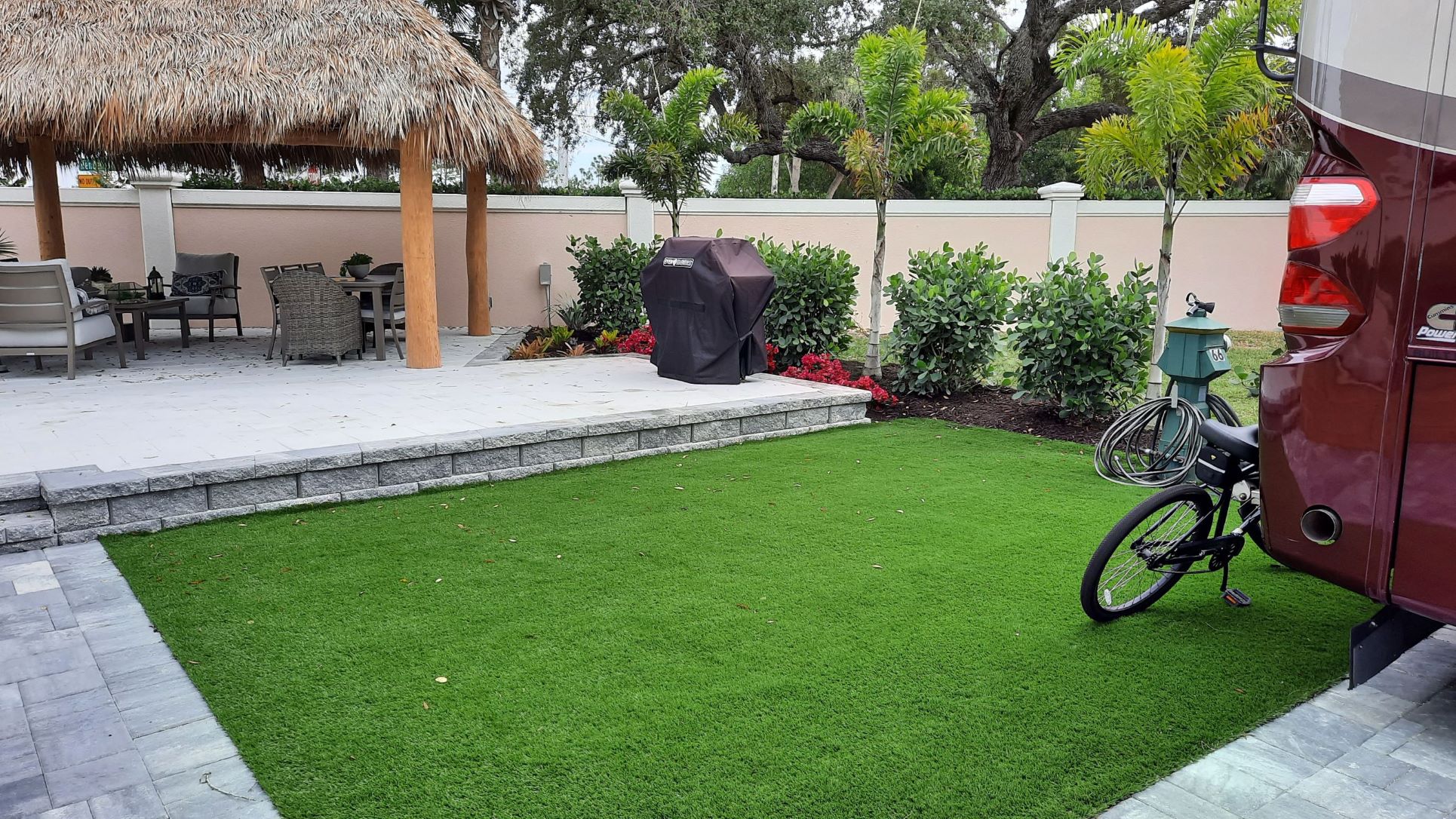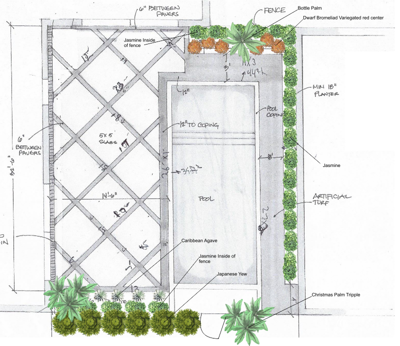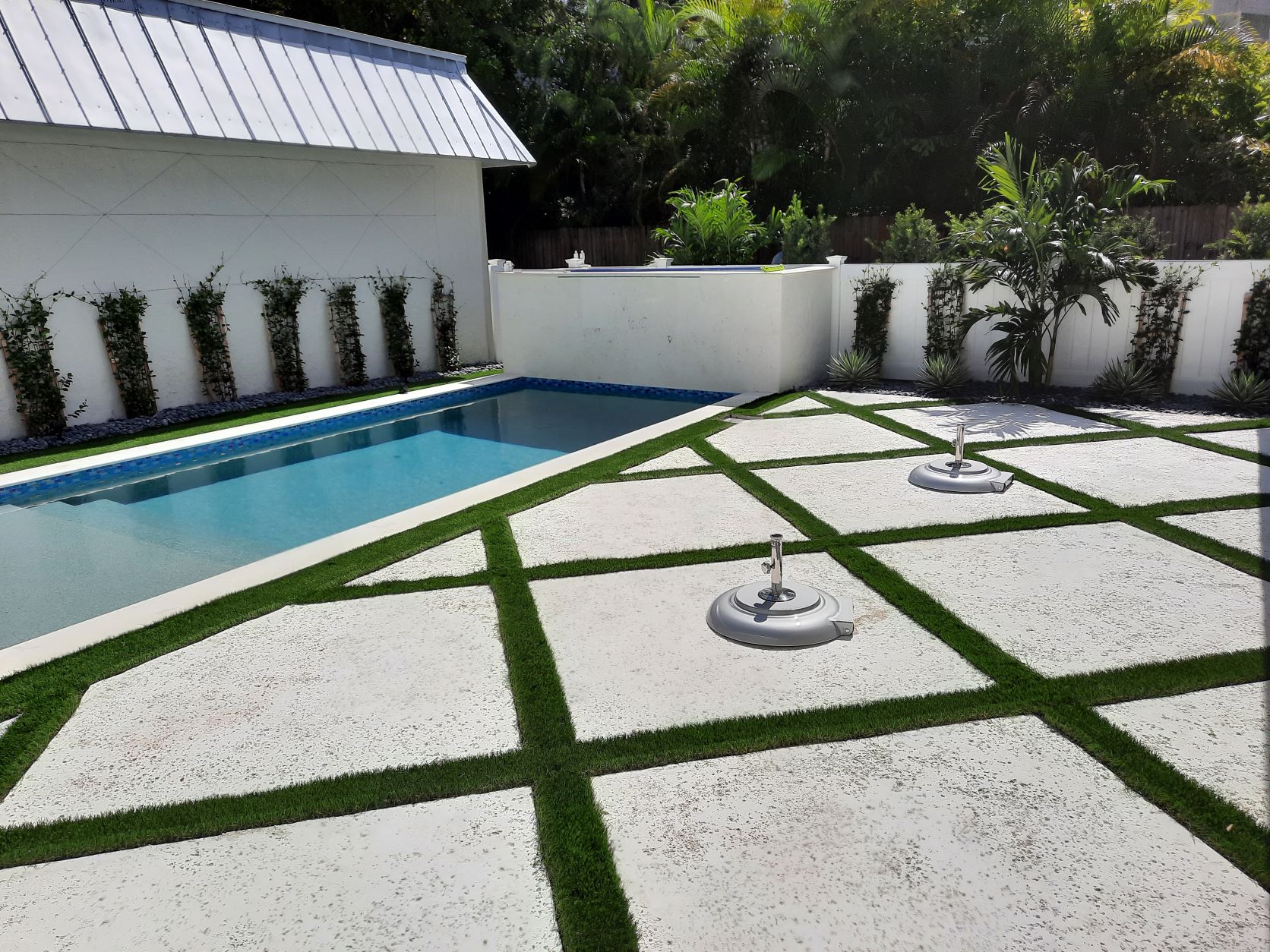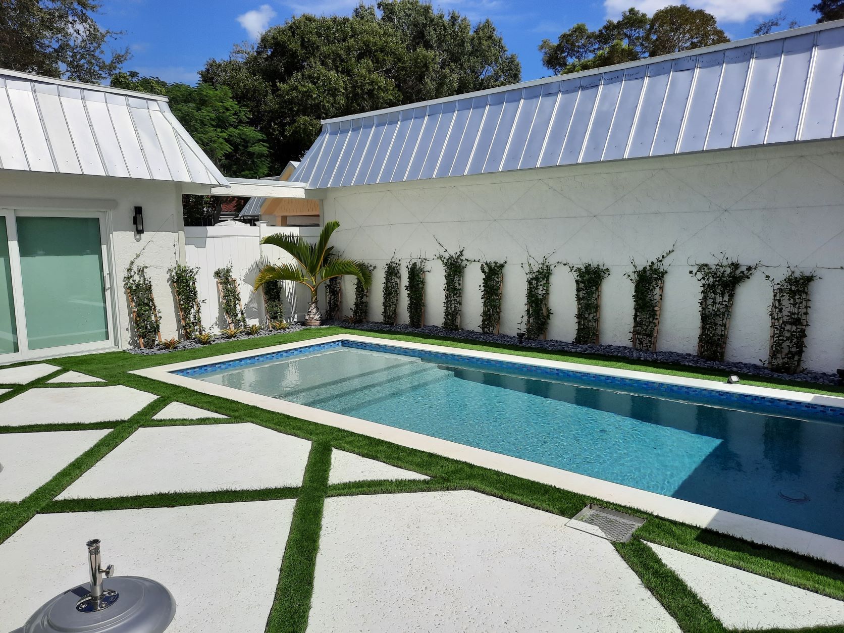 This project features a modern resort style design. Features include maintenance free artificial turf. Tropical plantings, Clusia Privacy Hedge, Foxtail Palms for shade and landscape lighting.