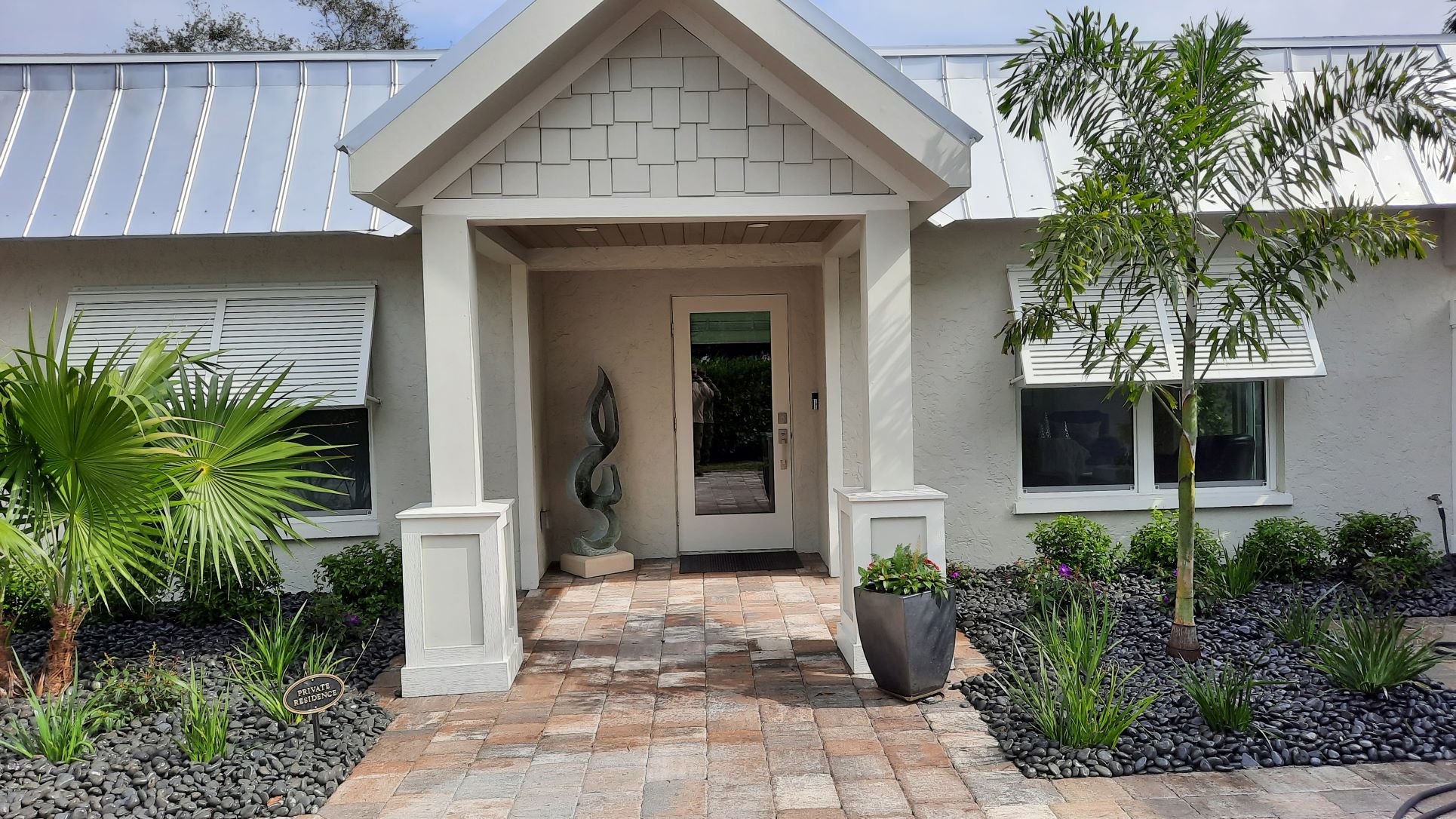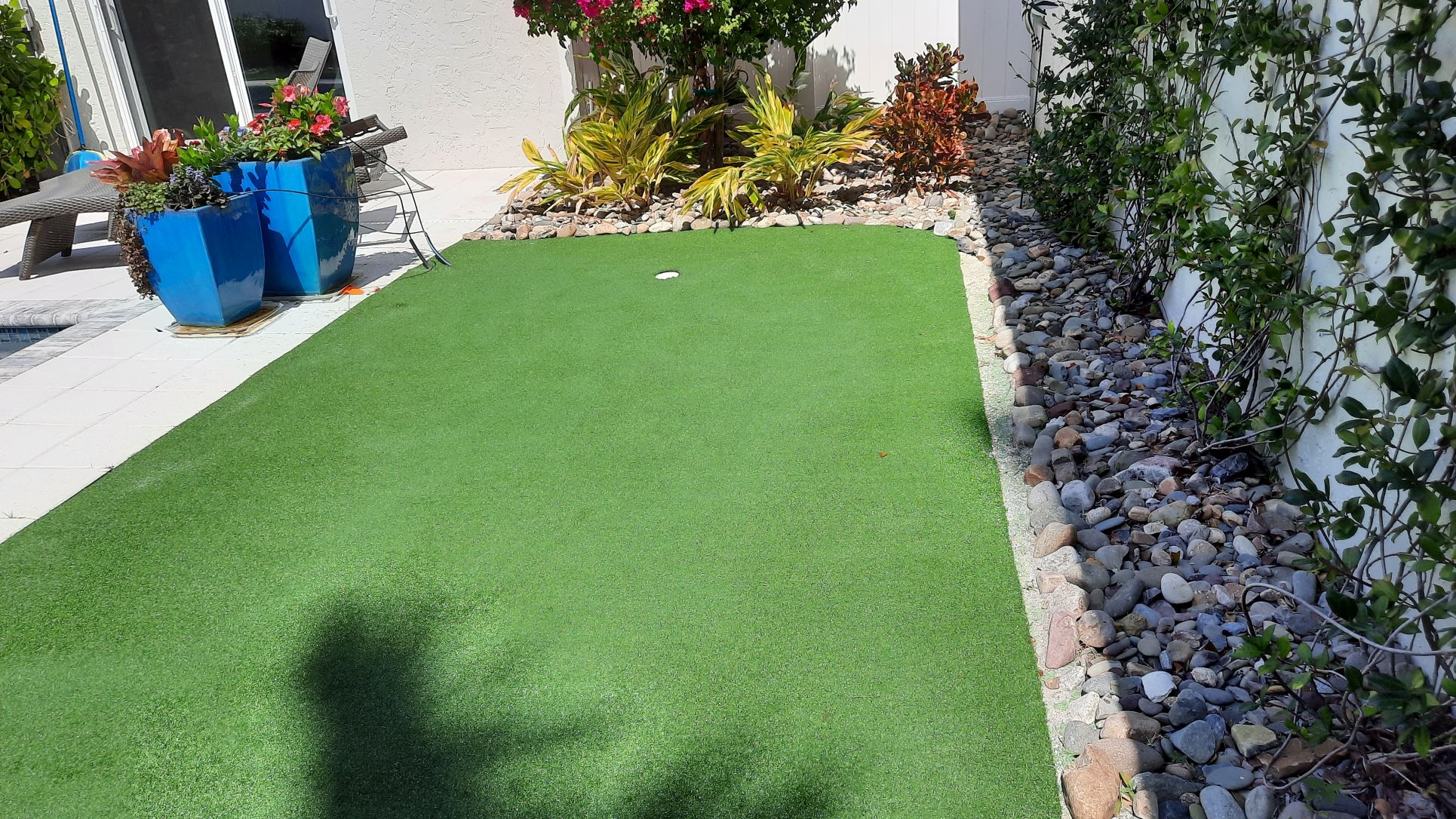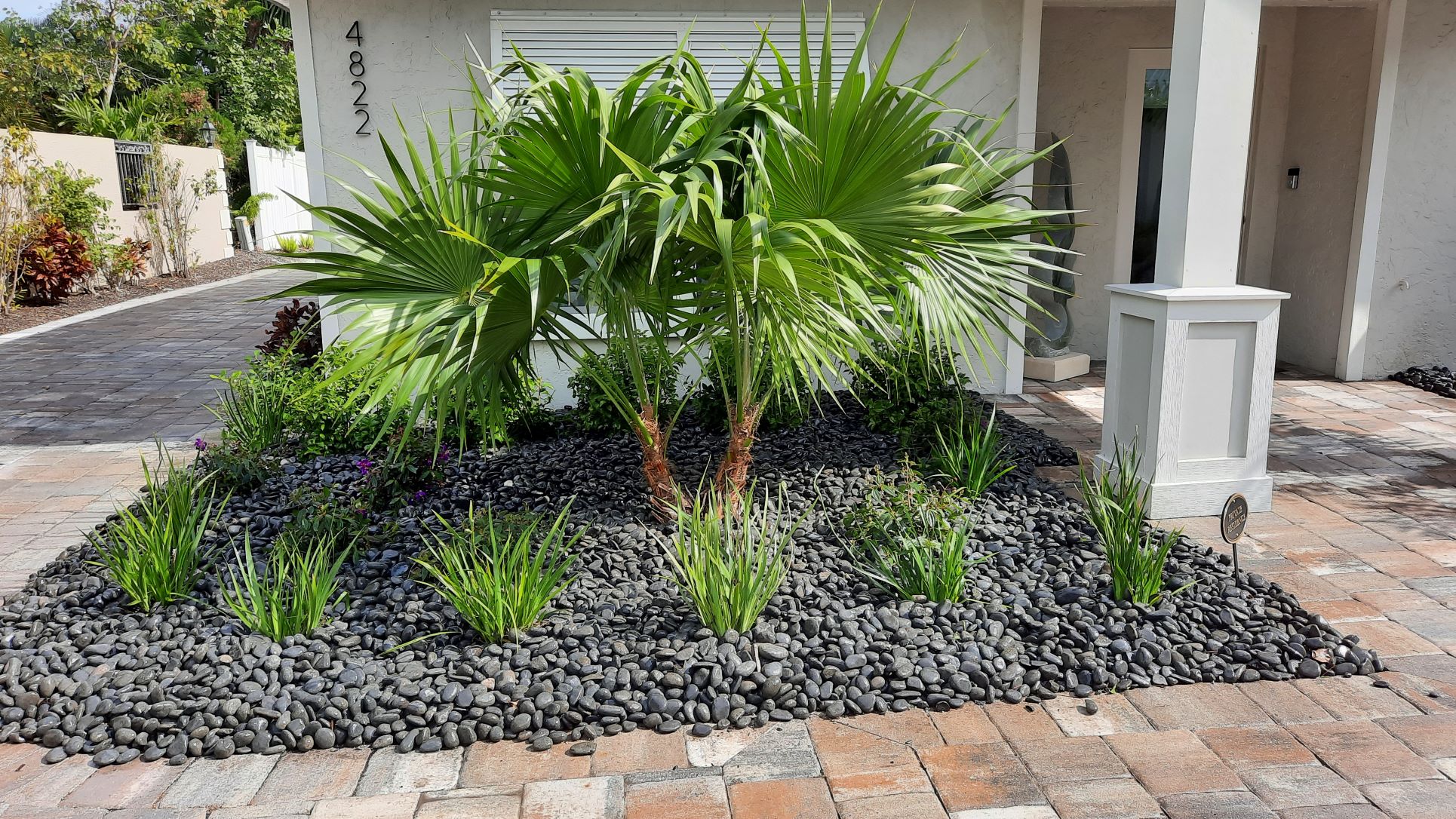 This project features a modern resort style front entry design. Features include maintenance free artificial turf. Tropical plantings, Flowering dwarf turbochina, bottle palms, Miami beach pebbles and landscape lighting.