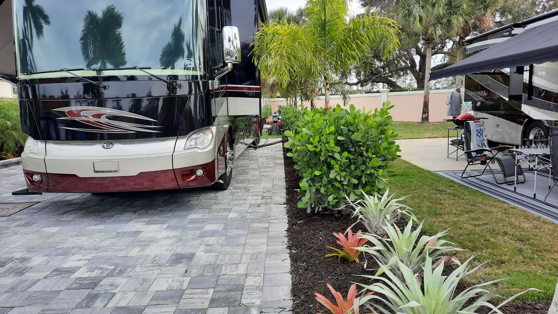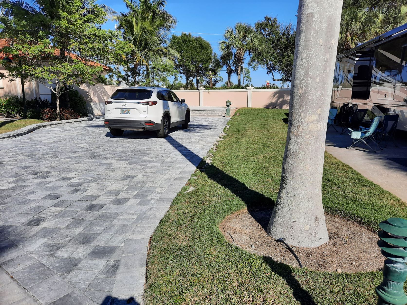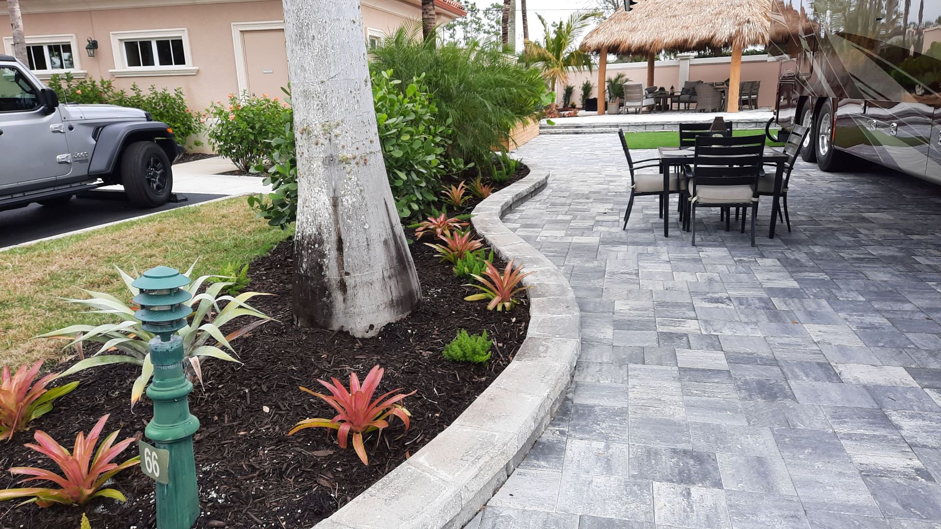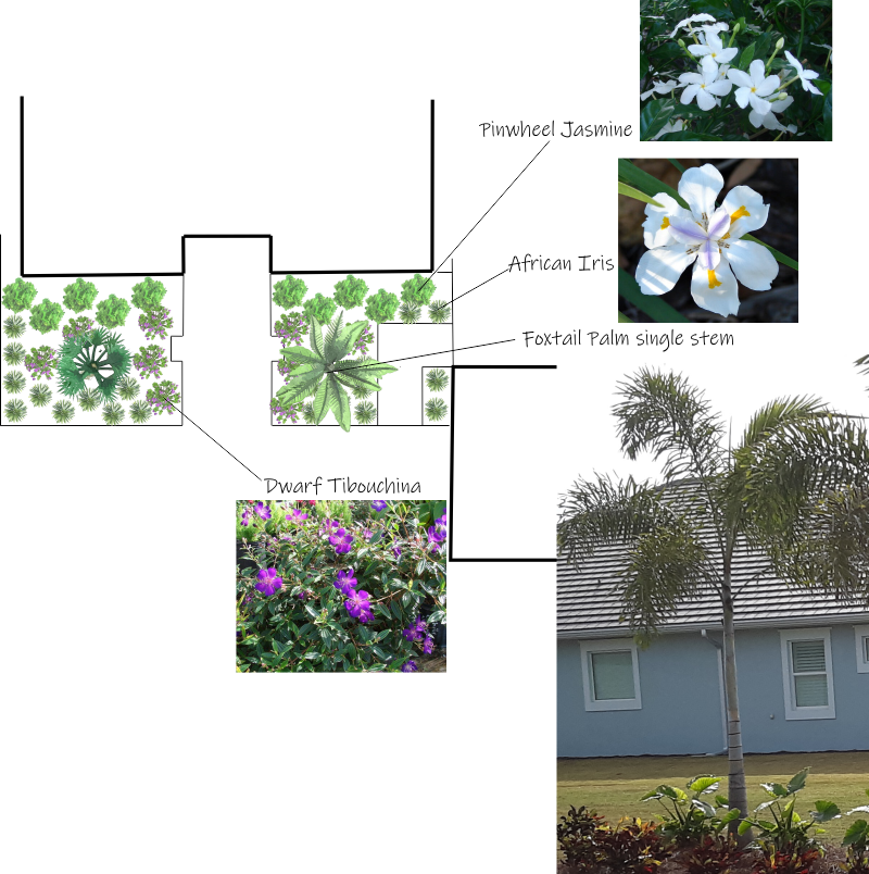 This project features a modern resort style front entry design. Features include maintenance free artificial turf. Tropical plantings, Flowering dwarf turbochina, bottle palms, Miami beach pebbles and landscape lighting.