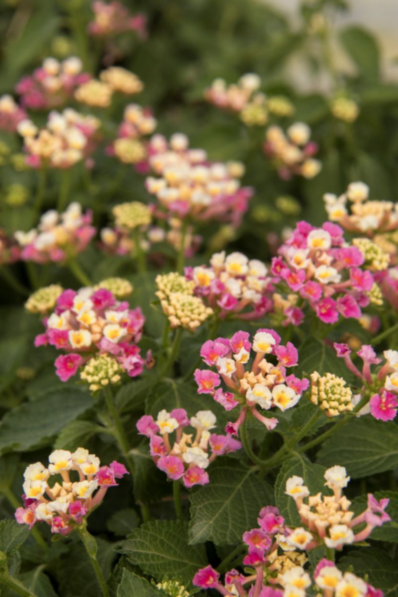 A showy, heat and drought tolerant shrub with large, bright pink and yellow flower clusters. The tidy, mounded, trailing habit works well in borders, containers, and mass plantings. Blooms continuously from early spring until first frost, without deadheading. Evergreen in frost-free areas; treat as an annual elsewhere.