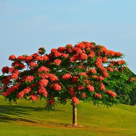 Marking the start of spring each year with thousands of bright red blooms, the Royal Poinciana Tree’s rich color is not commonly seen in other flowering varieties. In fact, it’s also called the ‘Flame Tree’ for its blazing color.